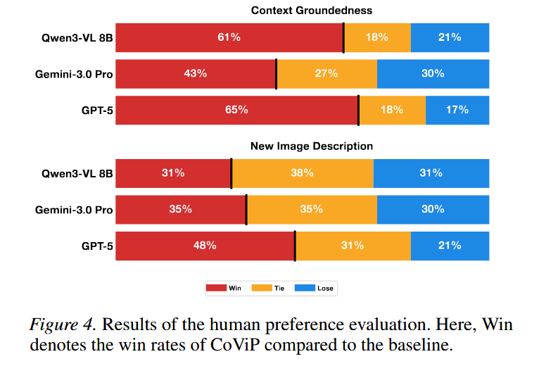 对比方式:每次给人看两条 caption(CoViP vs 某个 baseline),顺序随机