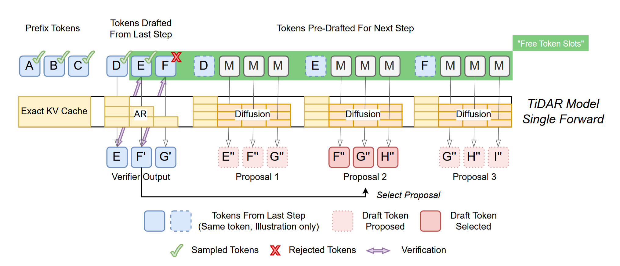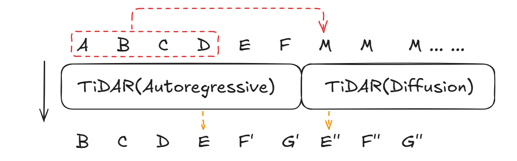 - 提出TiDAR架构,利用Free-token-slots,并行完成基于扩散的草稿和基于自回归的采样