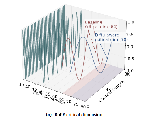 $$ \lambda_{baseline} = b^{-1}\cdot\left ( \frac{T_{target}}{2\pi} \right)^{\frac{d}{d_{crit}}}, d_{crit} = 2\left \lceil \frac{d}{2}\log_b \frac{T_{train}}{2\pi} \right \rceil $$b通常是10000