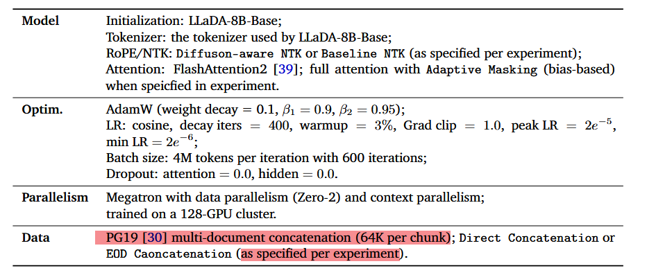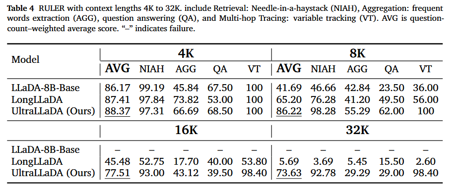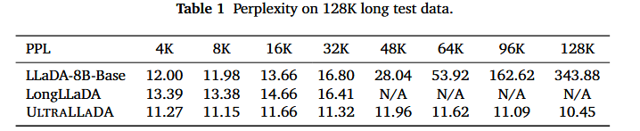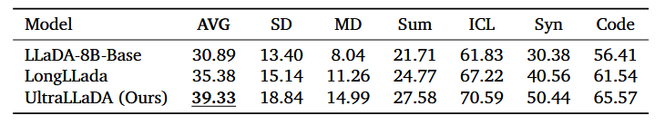 - UltraLLaDA,与LongLLaDA、LLaDA进行benchmark,证明是SOTA